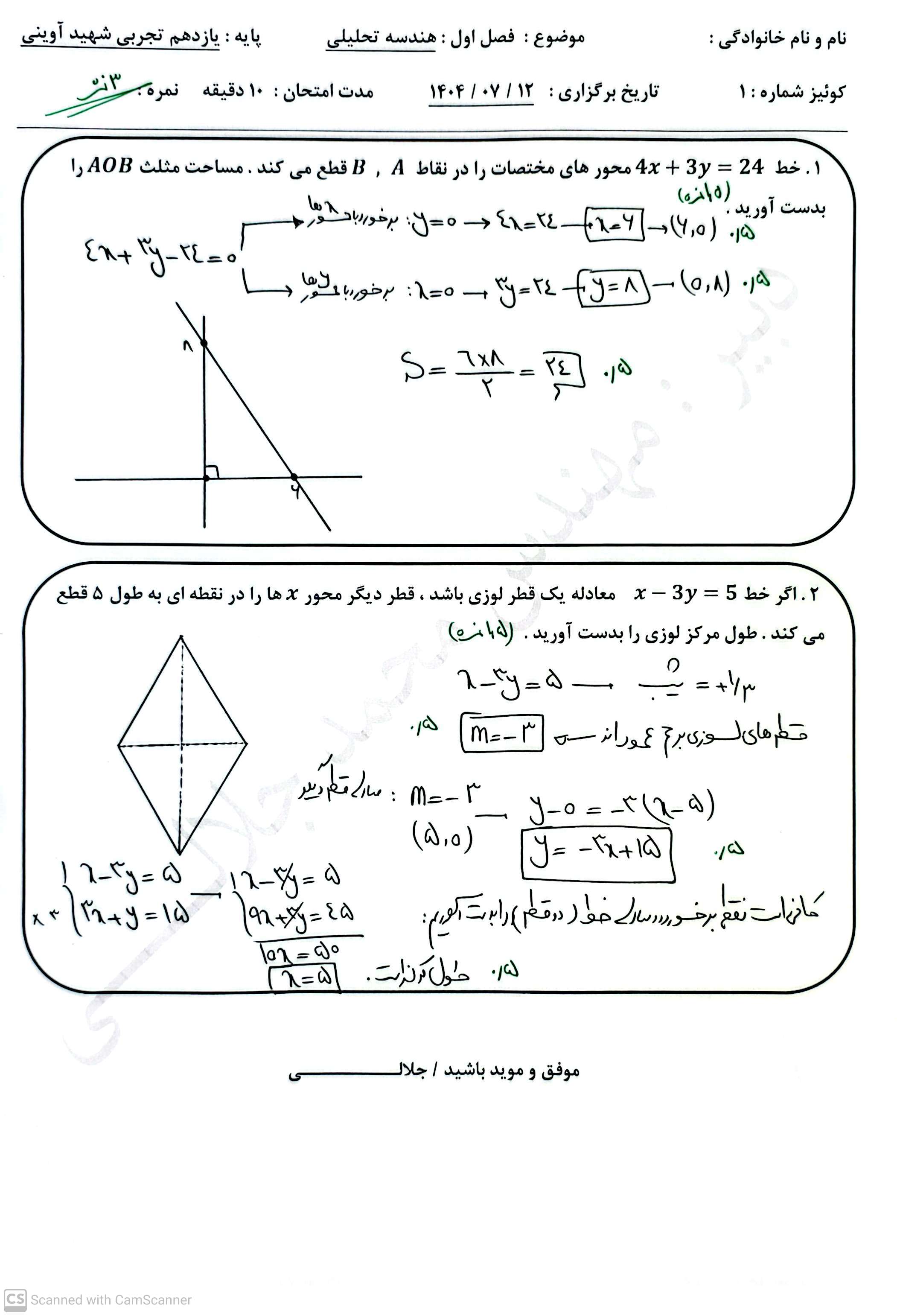 پاسخ کوئیز شماره ۱ یازدهم تجربی
