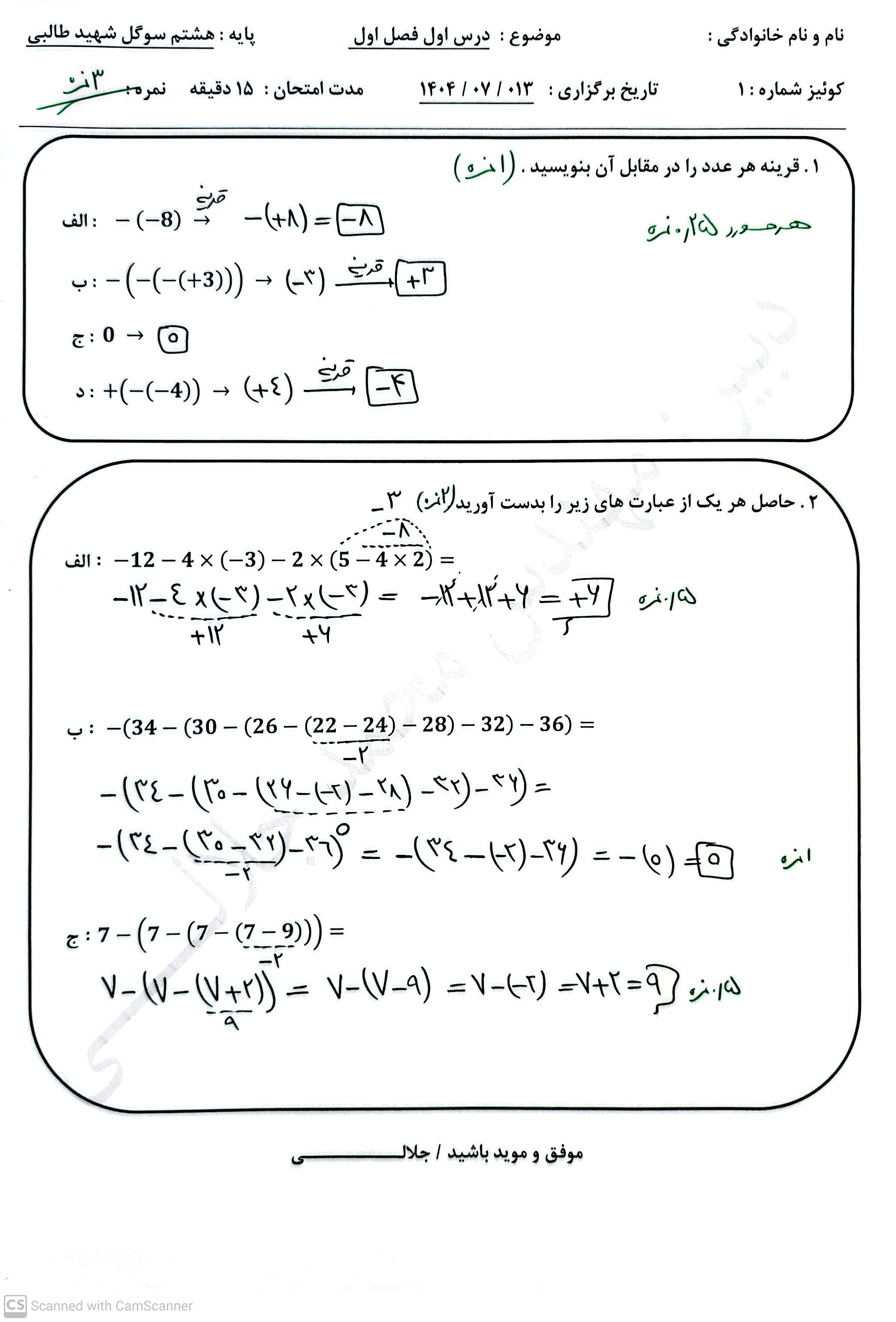 پاسخنامه کوئیز شماره 1 ریاضی هشتم سوگل شهید طالبی
